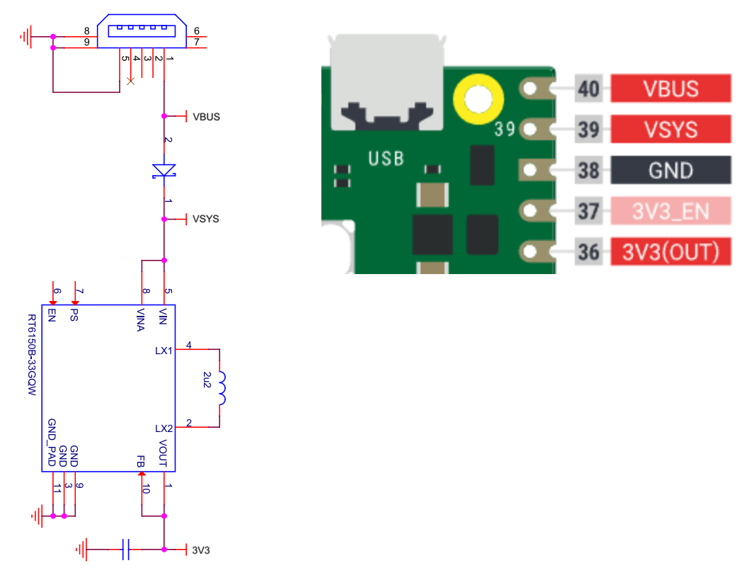 For clarity, here is a cut-down version of the RPi Pico schematic alongside a pinout of the RPi Pico.