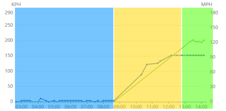 Here is the speed graph, same color coding: