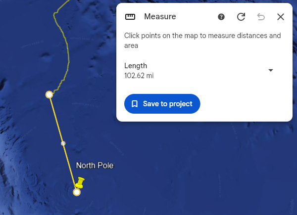 Google Earth also lets you measure distance in case you want to see distance from a thing. In this case, I'm measuring distance to the North Pole.